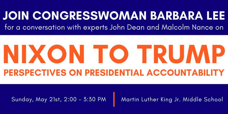 Congresswoman Barbara Lee hosted a town hall discussion on Sunday, May 21, at Martin Luther King Jr Middle School in Berkeley. The panel discussion, entitled “From Nixon to Trump: Perspectives on Presidential Accountability” featured John Dean and Malcolm Nance.