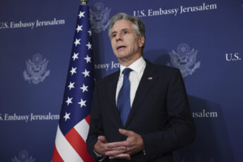 U.S. Secretary of State Antony Blinken speaks to media at the David Kempinski Hotel in Tel Aviv, Israel, Monday, Aug. 19, 2024. (Kevin Mohatt/Pool Photo via AP)