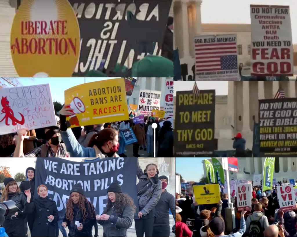 Photo collage of anti-abortion and pro-choice advocates outside Supreme Court abortion hearing.