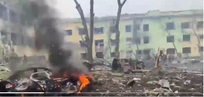 Photo is a screenshot of video of Ukraine hospital bombed out by Russian forces on March 9, 2022.