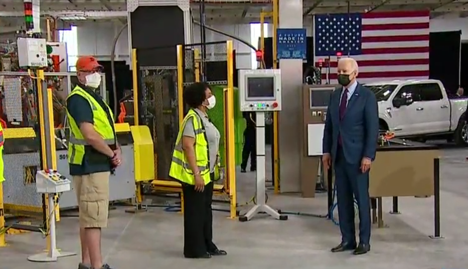 Photo screen shot of President Joe Biden at Ford electric vehicle plant in Dearborn, Michigan.