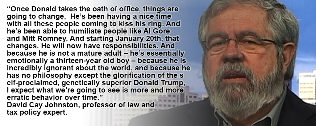 In a busy show, tax expert and Trumpologist, David Cay Johnston joins us to discuss the President-elect’s fitness for office, the “Deal Professor” Steven Davidoff Solomon unveils corporate shenanigans in Silicon Valley, and ocean conservationist, David Helvarg, tells us how Marco Rubio and Rick Scott deny climate change while their state of Florida sinks.