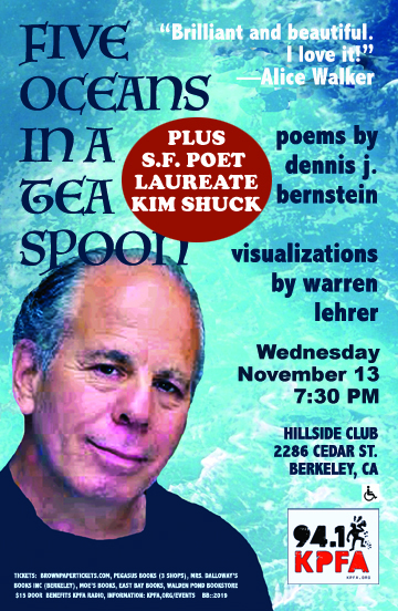 Advance tickets: $12: brownpapertickets.com :: T: 800-838-3006 or Pegasus Books (3 sites), Books Inc (Berkeley), Moe’s, Walden Pond Bookstore, East Bay Books, Mrs. Dalloway’s $15 door, benefits KPFA Radio 94.1FM