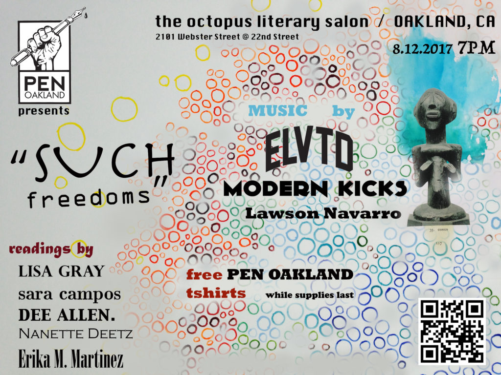 PEN Oakland is a literary collective and branch of PEN Center USA. This non-profit, all-volunteer organization presents “Such Freedoms,” an event to feature local artists who’ve each already raised their fists in celebration of their freedoms, such as they are … Focus on the readings. Feel the music. And come for the free “PEN Oakland” t-shirts, while supplies last.